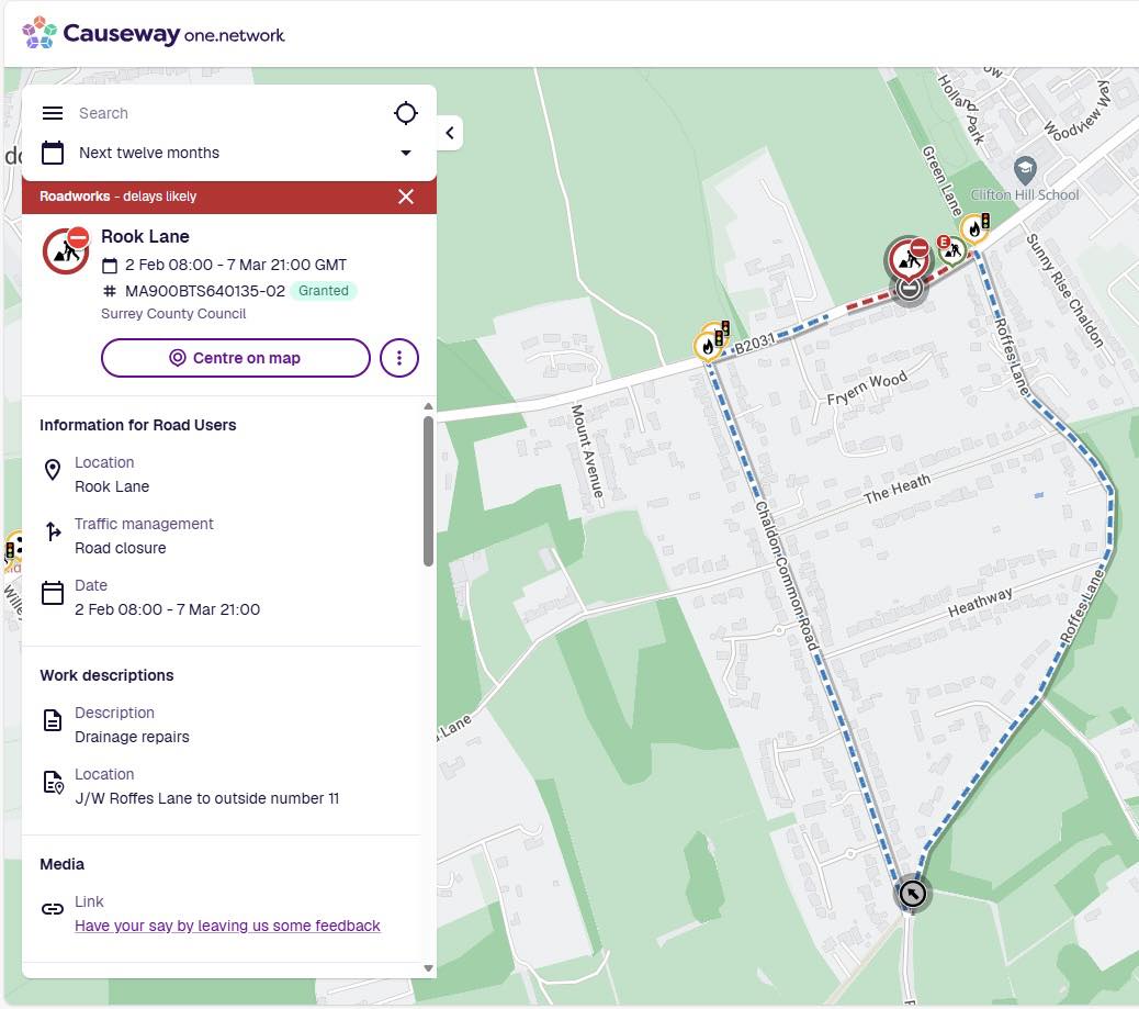 Road Closure between Roffes Lane and Chaldon Common Road for drainage works from 2nd February to 7th March. Access to Surrey National approaching from Caterham on the Hill will be via a diversion.